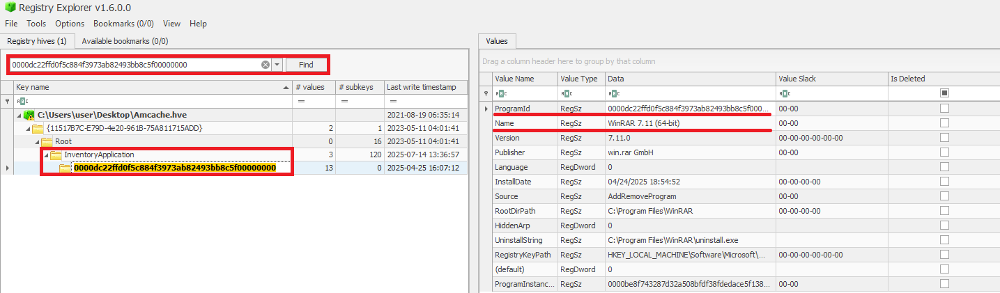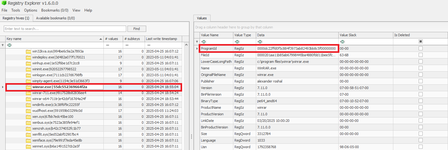 , isso confirma que o executável não está/estava apenas presente ou foi executado, mas foi formalmente instalado. Essa distinção nos ajuda a separar cópias ou execuções temporárias do software propriamente instalado. A figura a seguir destaca o ProgramId do software WinRAR na chave InventoryApplicationFile