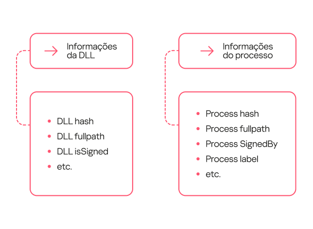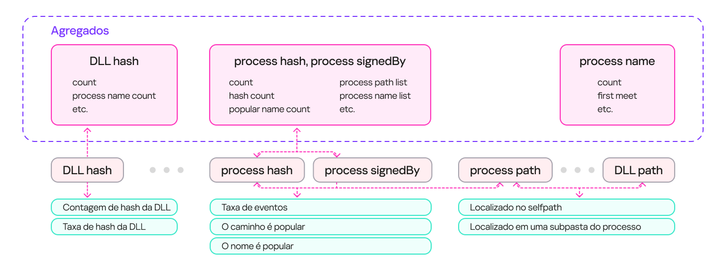 O resultado foi um sistema com diversos agregados (conjuntos de contadores e chaves) que podiam descrever um evento de entrada. Esses agregados podem conter uma única chave (por exemplo, a hash sum de uma DLL) ou várias chaves (por exemplo, a hash sum de um processo + a assinatura do processo). Com base nesses agregados, é possível derivar um conjunto de características que descrevem o evento de carregamento da biblioteca. O diagrama abaixo fornece exemplos de como essas características são derivadas: