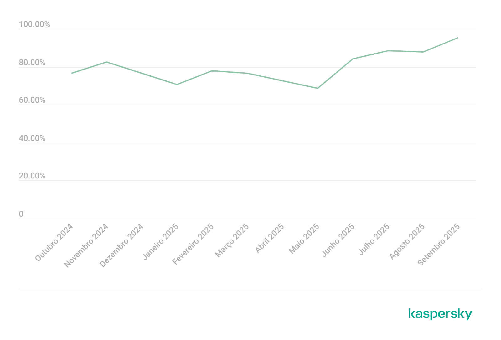 Tendências de detecção de DLL hijacking para os três modelos, de outubro de 2024 a setembro de 2025 (download)