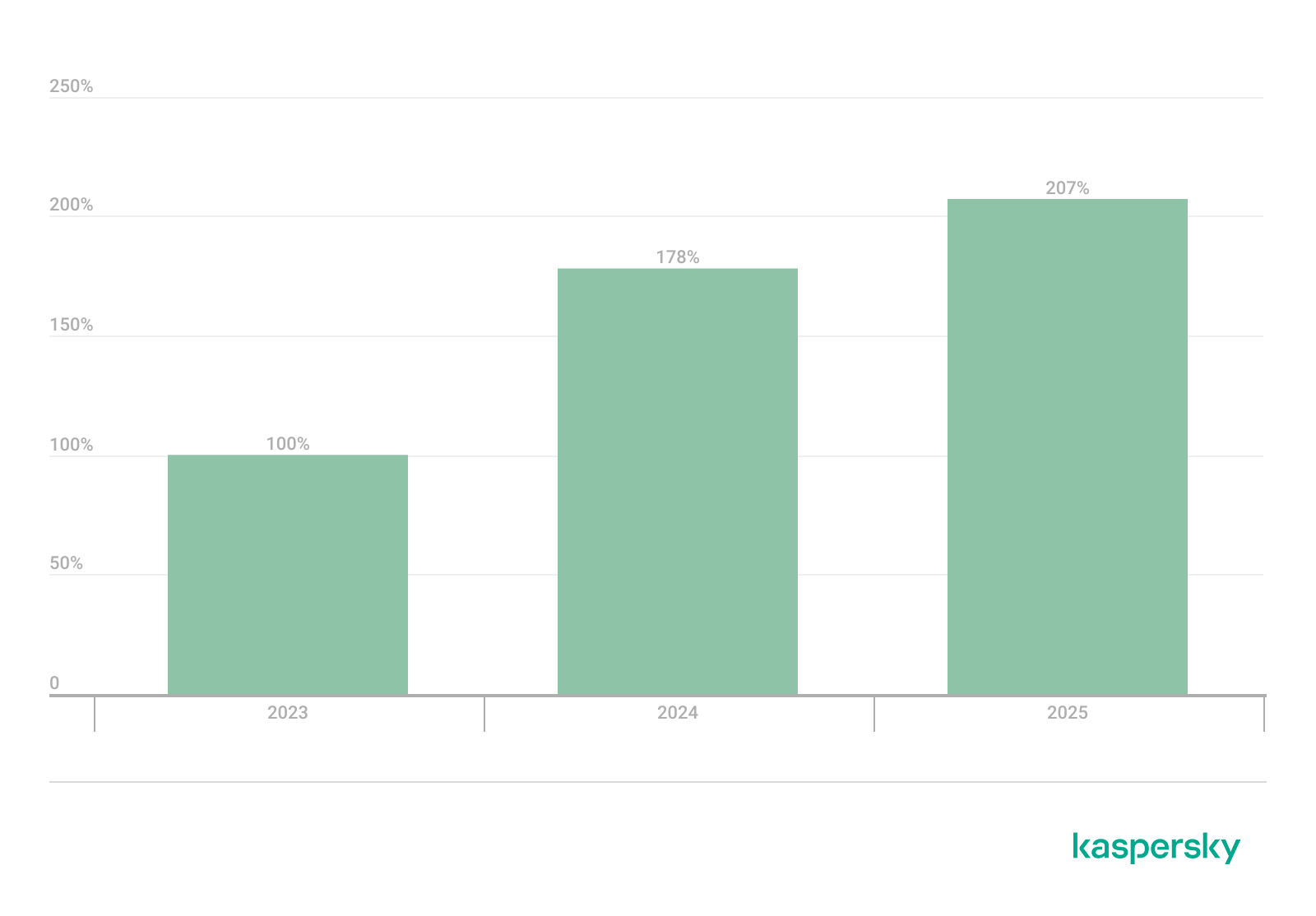 Tendência no número de ataques de DLL hijacking. Os dados de 2023 são considerados como 100% (download)