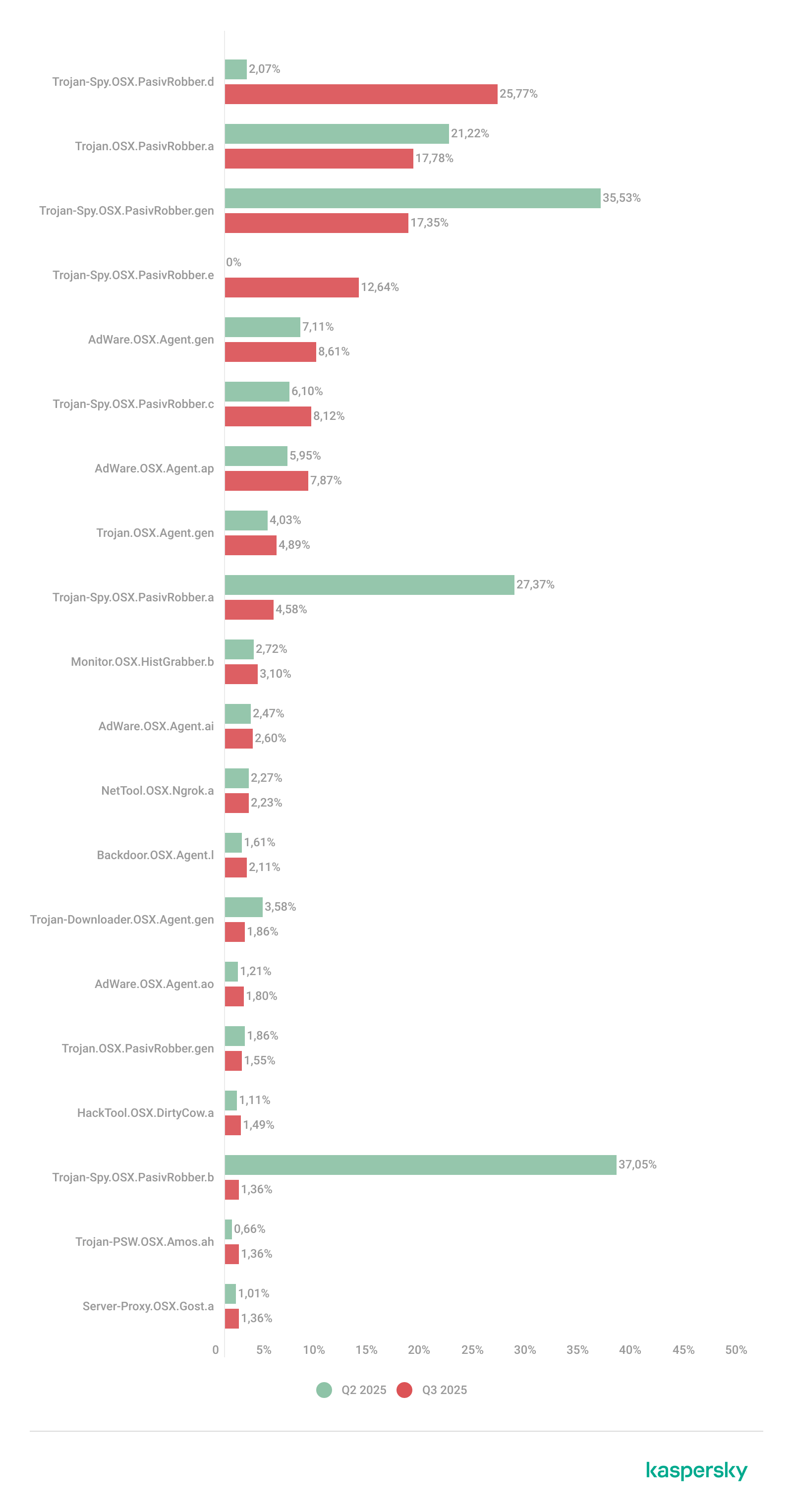 O spyware PasivRobber continua intensificando suas atividades. Suas modificações ocupam as primeiras posições na lista das ameaças mais comuns para macOS. Também se destacam os trojans Amos, voltados ao roubo de senhas e dados de carteiras criptográficas, e diversos aplicativos de publicidade. Os backdoors Backdoor.OSX.Agent.l, em 13º lugar, são uma variante do conhecido malware de código aberto Mettle.