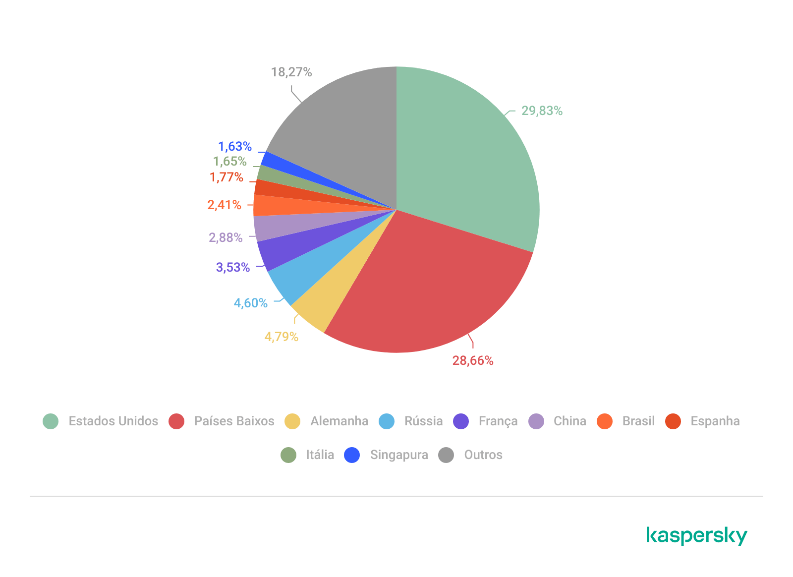 Essas estatísticas mostram a distribuição geográfica dos ataques da internet bloqueados pelos produtos da Kaspersky (páginas com redirecionamento para exploits, sites com exploits e outros programas maliciosos, centros de controle de botnets, etc.). Cada host único pode ter sido fonte de um ou mais ataques.