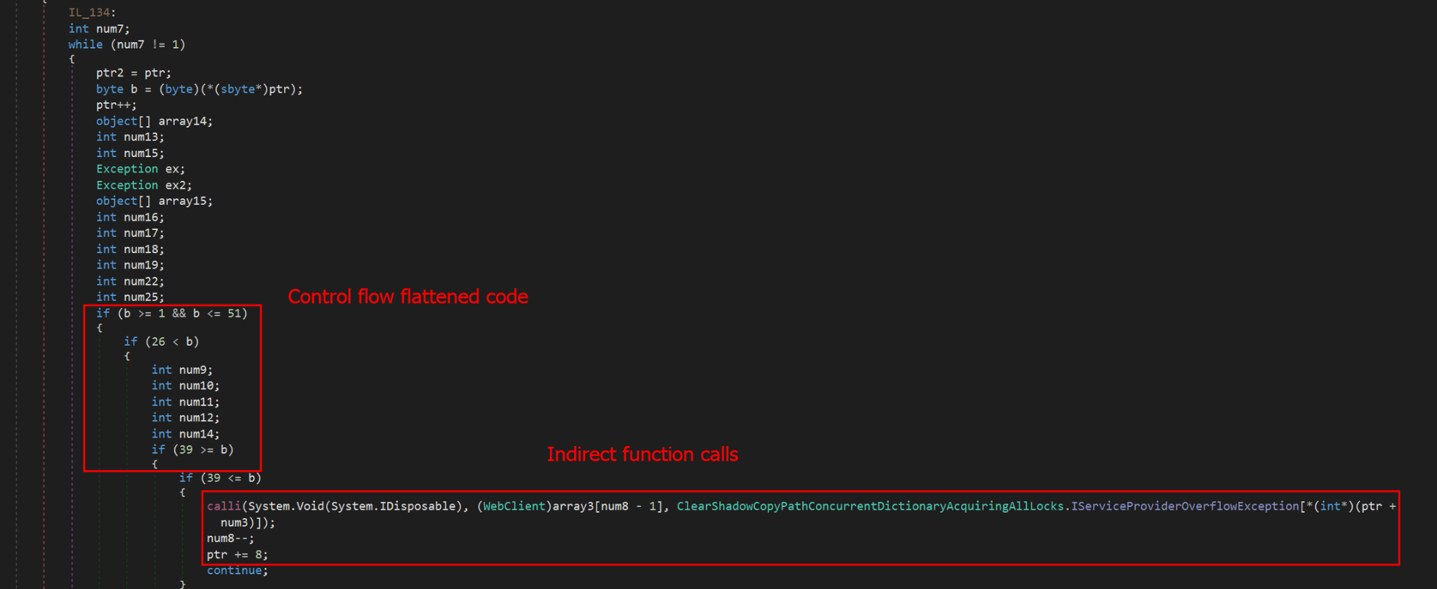 O loader .NET inicial é fortemente ofuscado usando o Control Flow Flattening e chamadas indiretas de função, armazenando-as em um grande vetor de funções e chamando-as a partir daí. Além da ofuscação, ele também utiliza nomes aleatórios de métodos e variáveis para dificultar a análise. Mesmo assim, após nossa análise, conseguimos reconstruir (até certo ponto) seu fluxo principal, que consiste em baixar e descriptografar dois payloads.