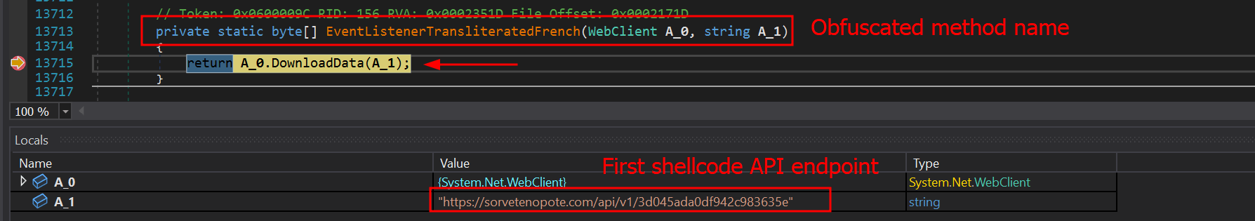 Após o segundo shellcode do Donut ser descriptografado e iniciado, ele carregará outro downloader usando o mesmo método de ofuscação do anterior. Ele se comporta de forma semelhante, mas desta vez baixará um arquivo PE em vez de um shellcode do Donut. Este arquivo PE é outro assembly .NET que será carregado no processo como um módulo.