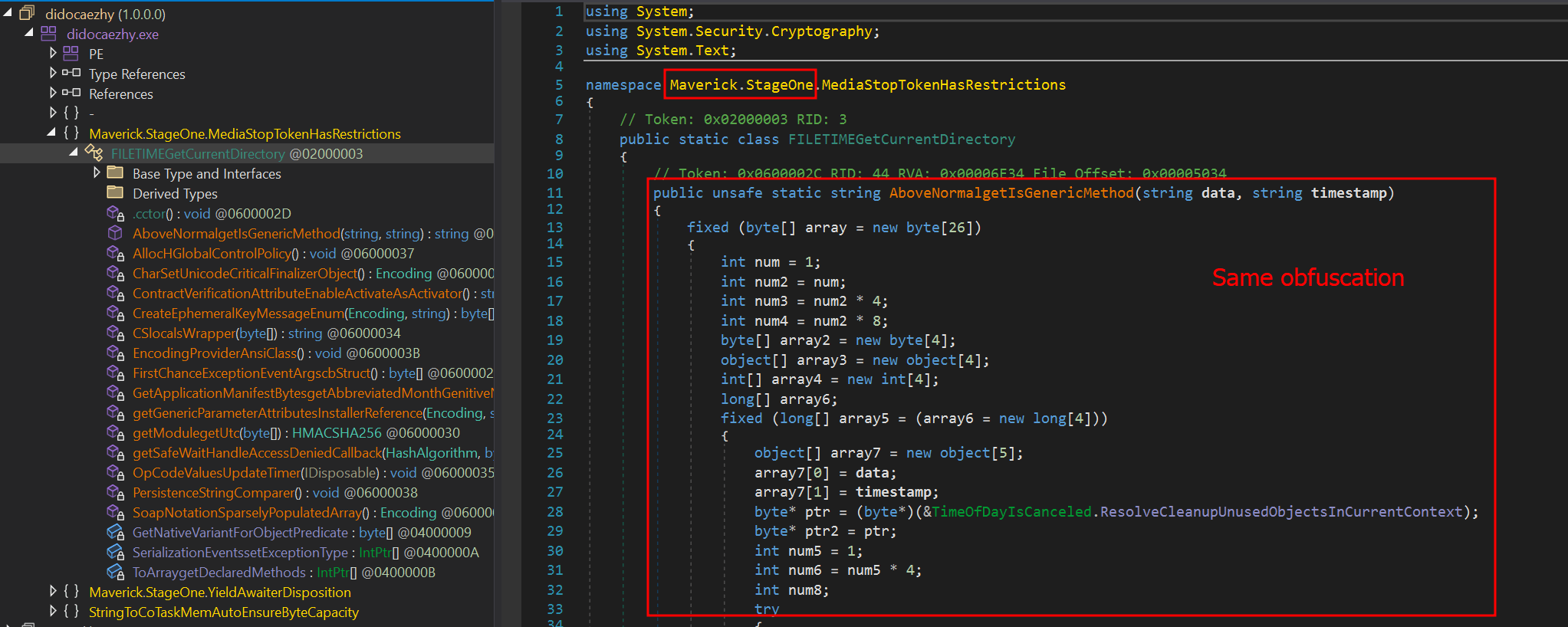 Se algum desses bancos for encontrado, o programa descriptografar outro arquivo PE usando o mesmo algoritmo descrito na seção Loader inicial em .NET deste relatório e o carregará como um assembly, chamando seu ponto de entrada com o nome do banco aberto como argumento. Esse novo PE é chamado de “Maverick.Agent” e contém a maior parte da lógica do banco para contatar o C2 e extrair dados com ele.