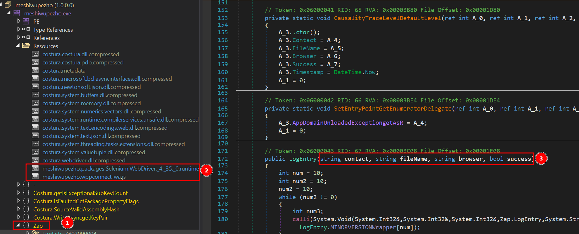 Este módulo, que também é ofuscado, é o infector do WhatsApp e representa o payload final na cadeia de infecção. Ele inclui um script do WPPConnect, um projeto de automação do WhatsApp, de código aberto, além do executável do navegador Selenium, usado para automação web.