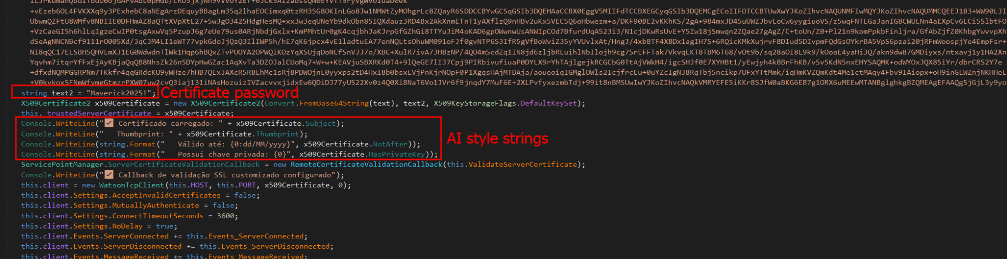 A comunicação utiliza a biblioteca WatsonTCP com túneis SSL. Ela utiliza um certificado X509 local criptografado para proteger a comunicação, o que é outra semelhança com o malware Coyote. A conexão é feita com o host “casadecampoamazonas.com” na porta 443. O certificado é exportado como criptografado e a senha usada para descriptografá-lo é “Maverick2025!”. Após a descriptografia do certificado, o cliente se conectará ao servidor.