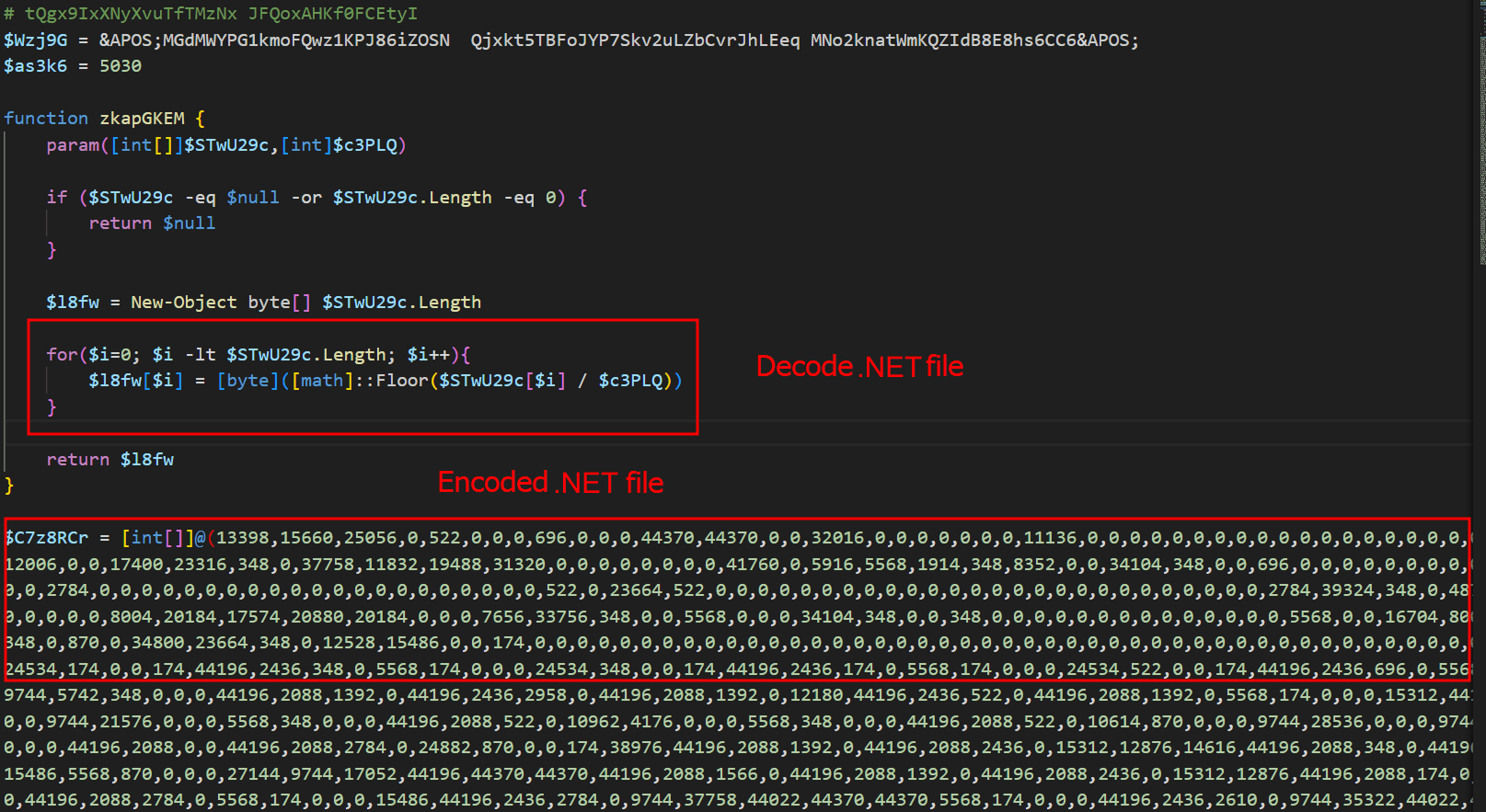 O script de entrada é usado para decodificar um arquivo .NET incorporado a ele, e tudo isso ocorre somente na memória. O arquivo .NET é decodificado dividindo cada byte por um valor específico; no script acima, o valor é “174”. O arquivo PE é decodificado e é então carregado como um assembly .NET dentro do processo do PowerShell, tornando toda a infecção fileless, ou seja, sem arquivos em disco.