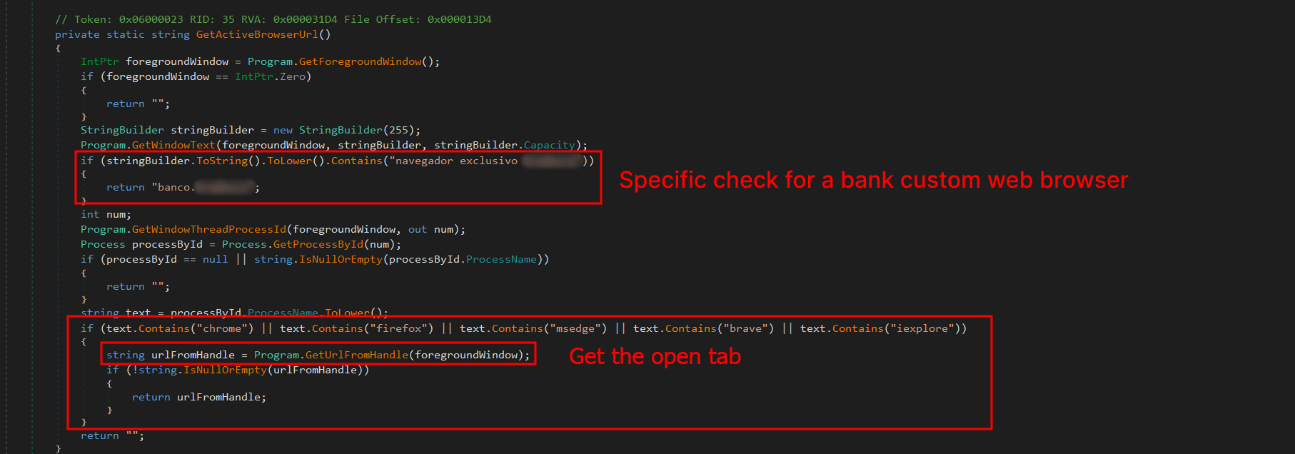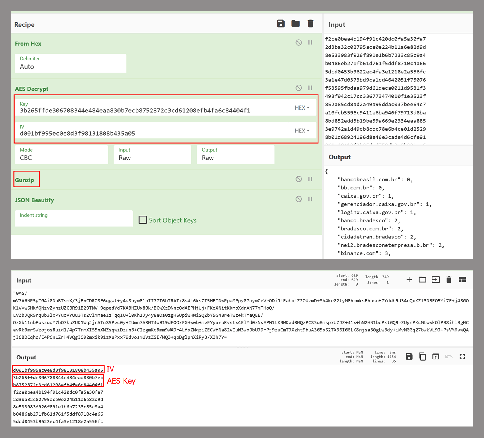 Se qualquer navegador da lista acima estiver em execução, ele usará a Automação de Interface do Usuário para extrair o título da guia aberta no momento e usar essa informação com uma lista predefinida de sites de internet banking de destino para determinar se deve executar alguma ação neles. A lista de bancos de destino é compactada com gzip, criptografada usando AES-256 e armazenada como uma string em base64. O vetor de inicialização (IV) do AES é armazenado nos primeiros 16 bytes dos dados em base64 decodificados, e a chave é armazenada nos 32 bytes seguintes. Os dados criptografados reais começam no deslocamento 48.
