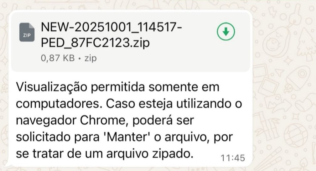 A infecção começa quando a vítima recebe um arquivo .LNK malicioso dentro de um arquivo ZIP por meio de uma mensagem do WhatsApp. O nome do arquivo pode ser genérico ou pode fingir ser de um banco: