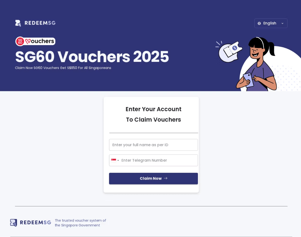 Outro tema que os golpistas exploraram foram os pagamentos governamentais. Em 2025, os cidadãos de Singapura receberam vouchers do governo, que tinham valores de 600 a 800 dólares, em comemoração ao sexagésimo aniversário do país. Para usá-los, os usuários deviam fazer login no site do programa. As páginas falsas tentavam imitar esse site. É curioso que, neste caso, os alvos foram contas do Telegram, ainda que no portal legítimo essa informação não fosse requerida.
