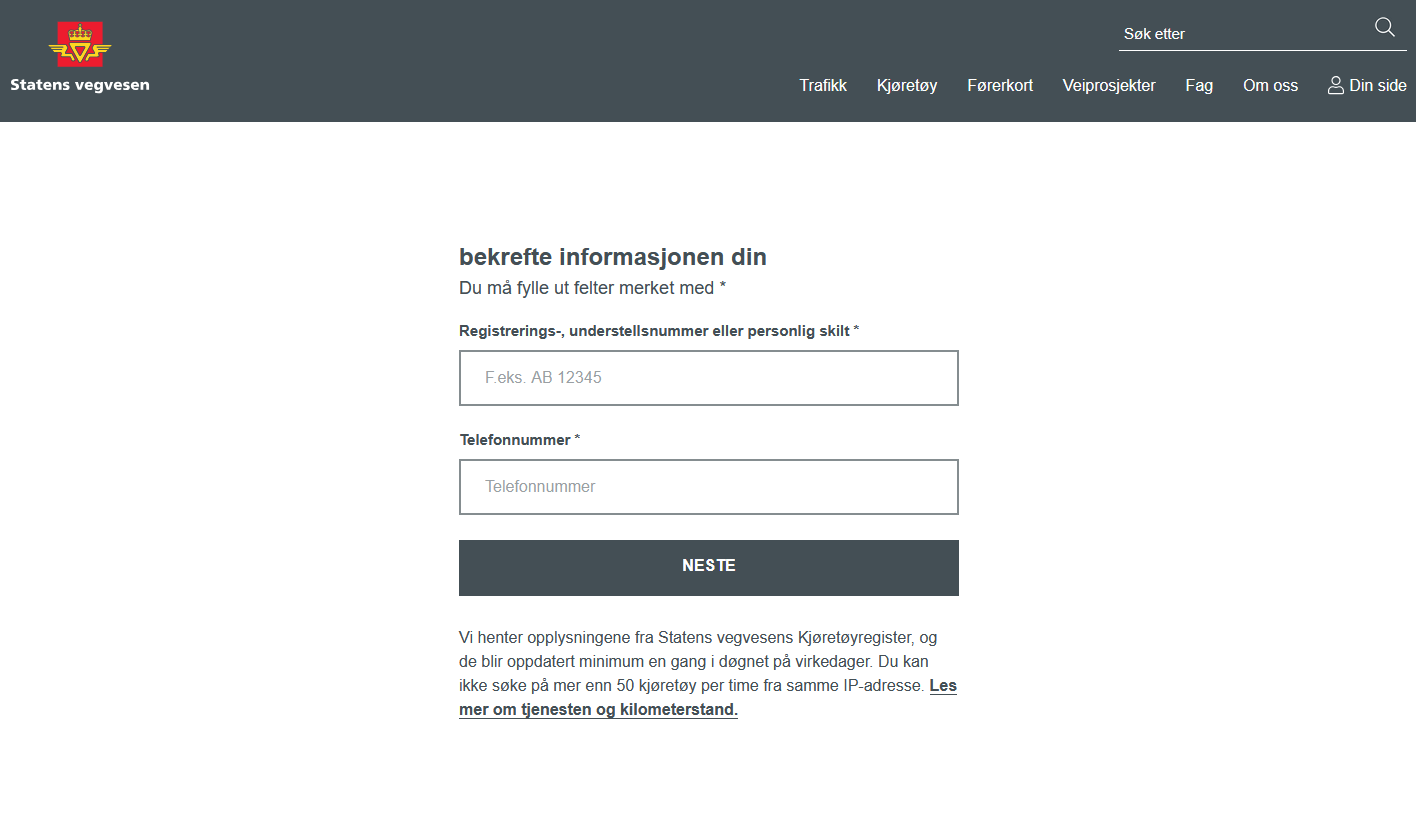 Detectamos uma fraude direcionada a usuários da Noruega que desejavam renovar sua carteira de motorista. Ao abrir o recurso, que imitava o site oficial da autoridade de transporte da Noruega, o visitante precisava indicar o número do veículo e um telefone de contato.