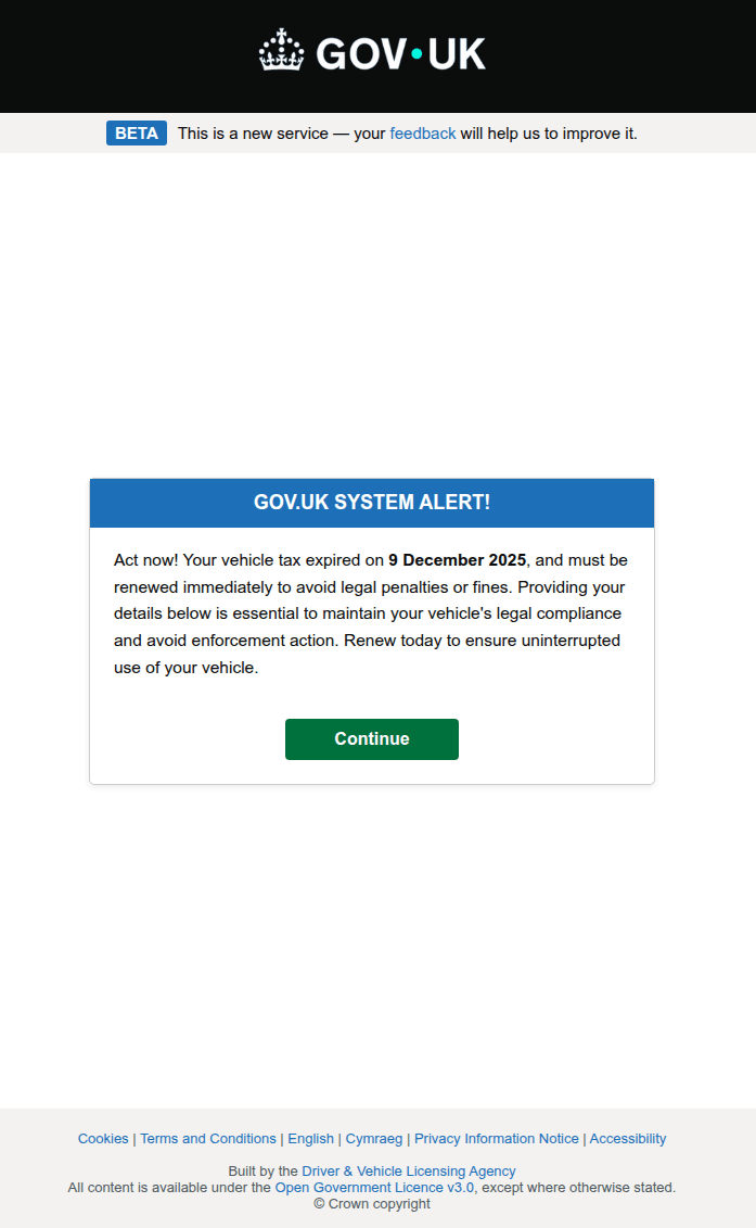 O chamado para realizar ações urgentes é um recurso clássico em cenários de phishing. Junto com a ameaça de perder bens, estes esquemas tornam-se uma isca para possíveis vítimas e desviam sua atenção da URL incorreta ou da má diagramação do site. Por exemplo, um aviso sobre um imposto veicular não pago tornou-se uma ferramenta para cibercriminosos que buscavam roubar dados do cadastro do portal governamental do Reino Unido.