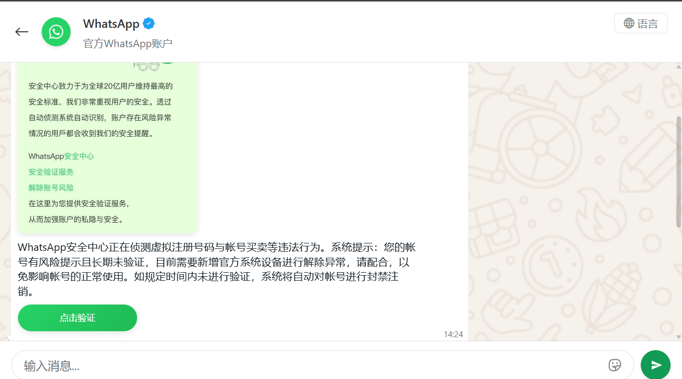 Na China circulavam páginas de phishing que clonavam por completo a interface do WhatsApp. Os invasores notificavam a vítima que sua conta havia sido vinculada a atividades ilegais e que devia passar por uma “verificação adicional”.