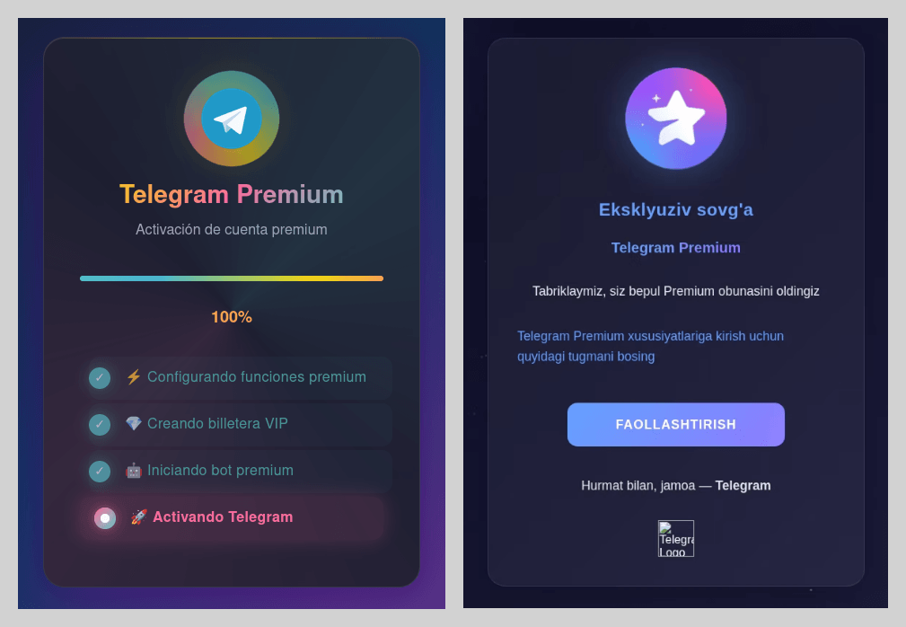 Os cibercriminosos também usaram muito a isca da assinatura gratuita do Telegram Premium. Se no ano passado víamos estas páginas de phishing apenas em russo e inglês, agora o alcance de zonas linguísticas se ampliou. Como antes, para ativar a assinatura, a vítima devia fazer login em sua conta, o que poderia causar perda de acesso.