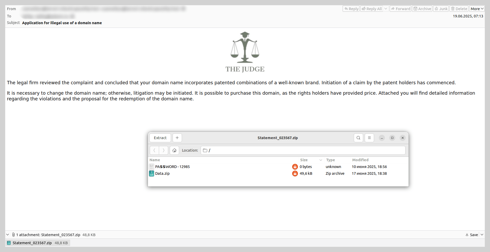 Por exemplo, os invasores enviavam e-mails em nome de escritórios de advocacia, ameaçando processar as vítimas por um suposto uso indevido de um nome de domínio. Solicitavam ao destinatário revisar possíveis vias de conciliação prévias ao julgamento, descritas em um documento anexado. O anexo continha um arquivo compactado sem senha; em seu interior, havia outro arquivo compactado criptografado cuja senha era fornecida em um documento à parte. Nesse arquivo, sob a aparência de um documento legal, havia um arquivo WSF malicioso que instalava um trojan no sistema por meio de inicialização automática. Depois, o trojan baixava e instalava o Tor em segundo plano e o utilizava para exfiltrar capturas de tela do usuário para seu servidor de comando e controle (C2) em intervalos programados.