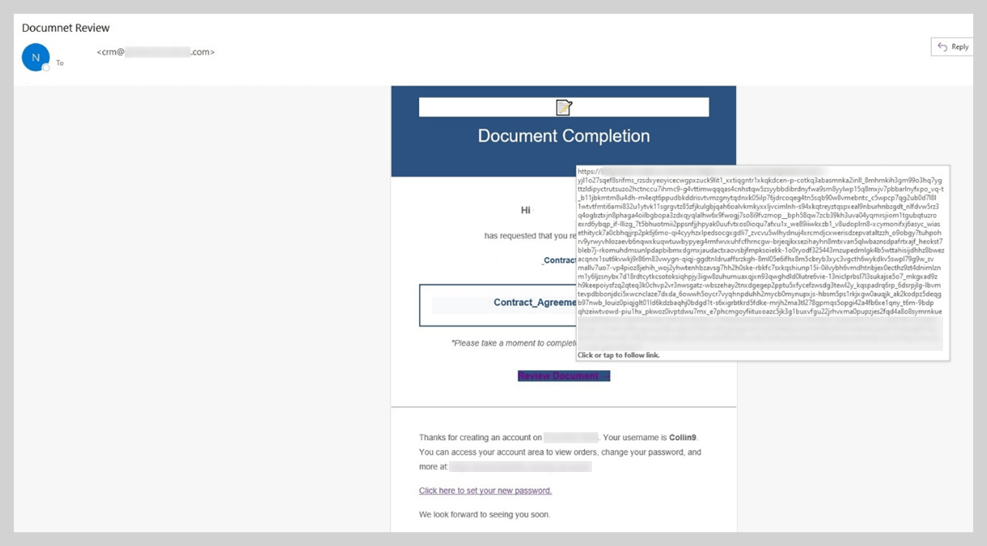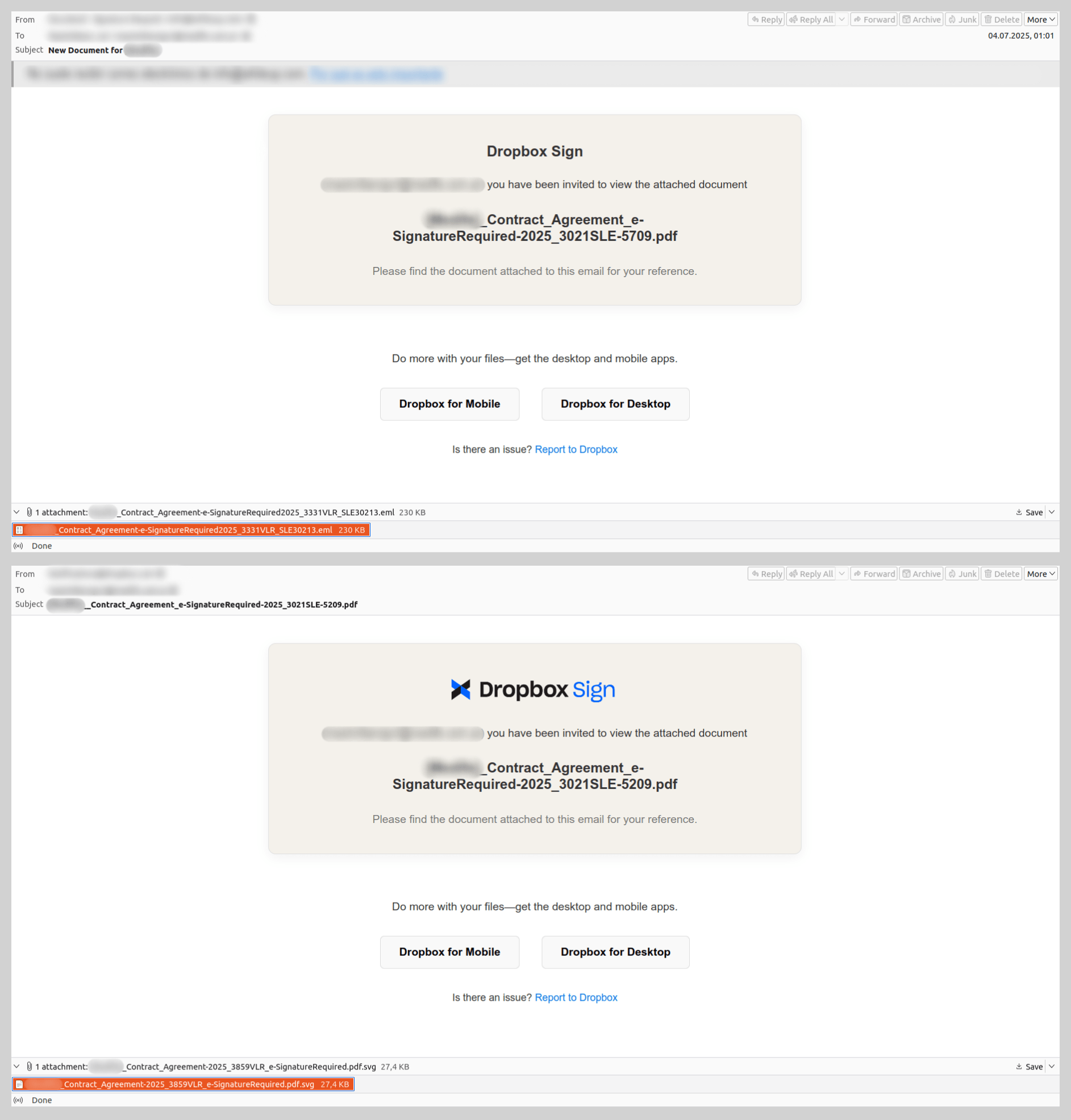 No e-mail, que supostamente vinha de uma plataforma conhecida de troca de documentos, notificam o destinatário que ele havia recebido acesso a um contrato anexado à mensagem. No entanto, no anexo não estava o PDF anunciado, mas outro e-mail chamado “contrato”. O texto dessa mensagem era o mesmo do original e o anexo continha um arquivo com dupla extensão: um arquivo SVG malicioso com um trojan disfarçado de documento PDF. Os golpistas, ao que tudo indica, tentavam ocultar o malware e evitar o bloqueio por uma solução de segurança.