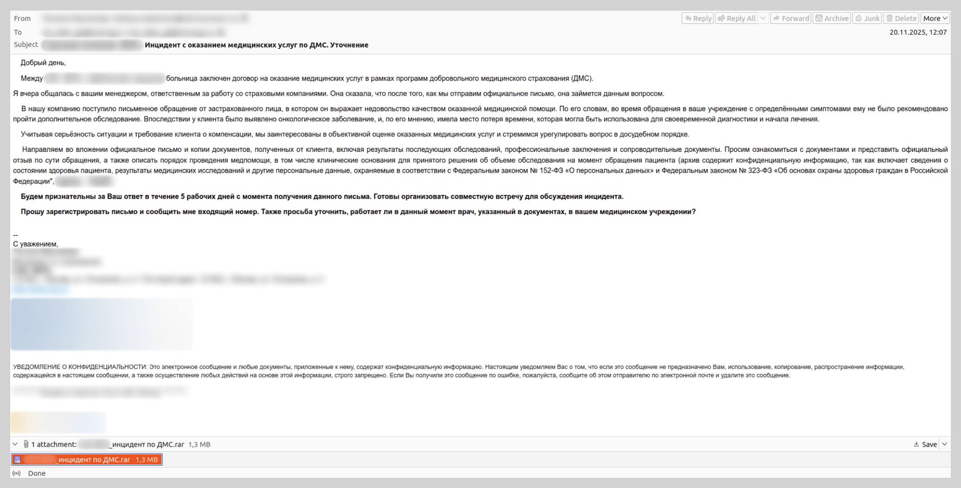 Também nos deparamos com e-mails com outro cenário. Neles, havia um pedido para os funcionários de uma instituição médica para aceitarem um paciente de outro hospital para observação e tratamento. Nessas mensagens também faziam referência a documentos médicos anexos com informações sobre o diagnóstico e o tratamento realizado, que na realidade eram arquivos compactados com arquivos maliciosos.