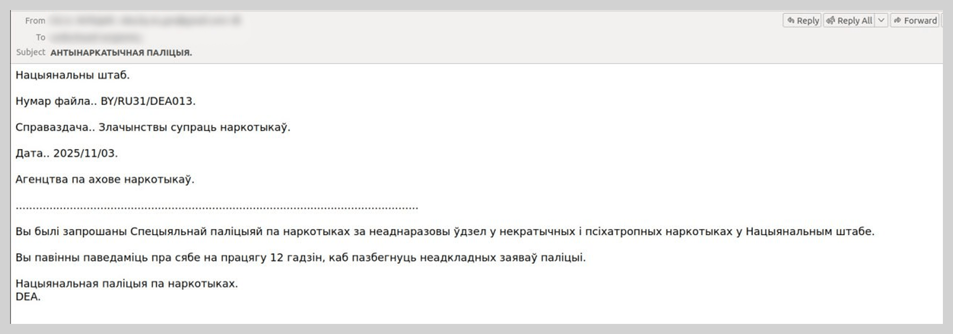 Por exemplo, encontramos mensagens com notificações sobre a abertura de uma ação penal, enviadas supostamente pela polícia russa. No entanto, as unidades policiais mencionadas no e-mail nunca existiram na Rússia. O conteúdo da intimação também podia fazer com que um usuário atento duvidasse de sua legitimidade, já que acusava o destinatário de cometer ações ilegais, como ver materiais proibidos. Esta extorsão baseava-se em induzir pânico na vítima, para que não verificasse o que estava escrito na intimação falsa.