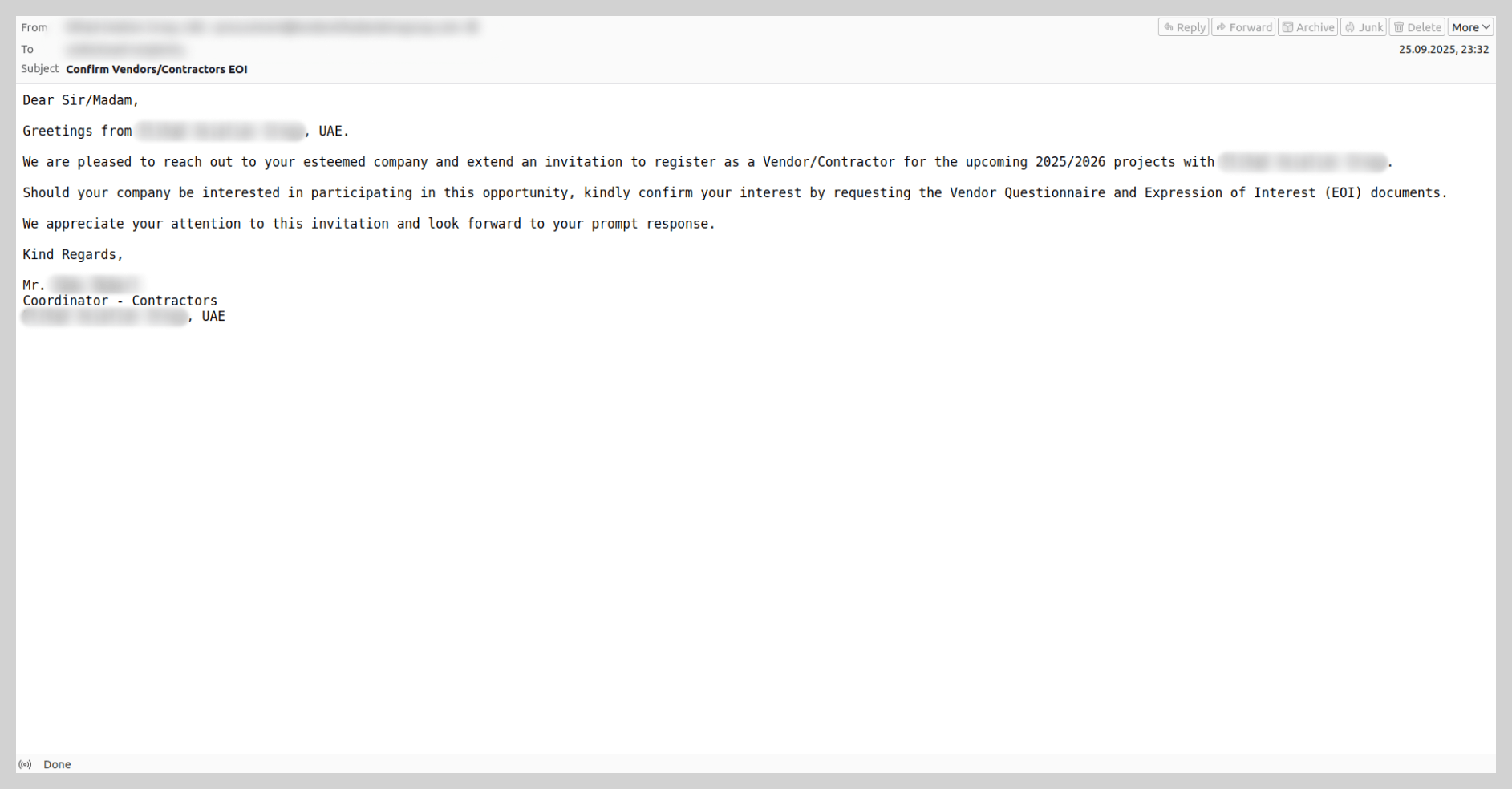 Estes e-mails foram detectados pela primeira vez em 2025 e já se tornaram um dos tipos mais difundidos de scam por e-mail. Apenas em dezembro de 2025, foram bloqueadas mais de 80.000 mensagens deste tipo. Os envios eram direcionados ao setor B2B e se distinguiam por sua variedade, que ia desde suas propriedades técnicas até a variação do texto e o número de marcas em cujo nome atuavam os cibercriminosos.