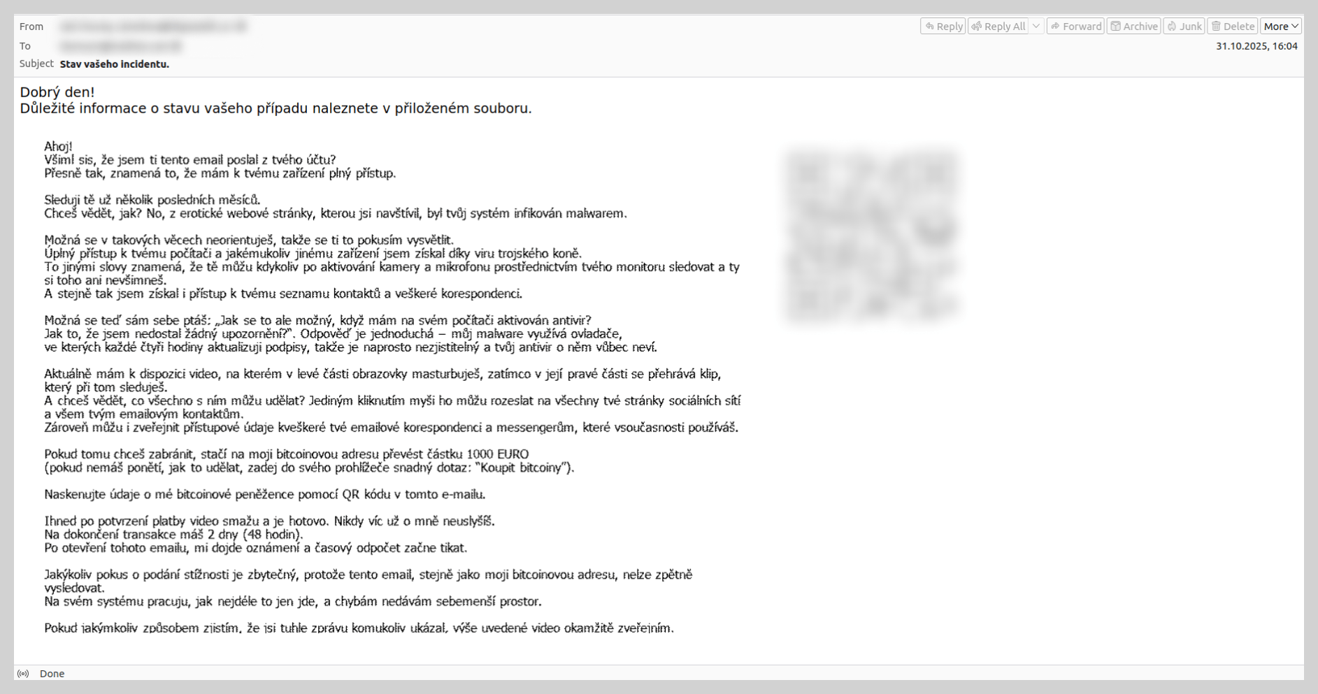 Em 2025 começamos a ver QR Codes não só em mensagens de phishing, mas também em e-mails de scam de extorsionários. No esquema clássico de chantagem por e-mail, costuma-se intimidar o usuário com a ideia de que hackers obtiveram acesso a dados confidenciais. Para que a informação pessoal da vítima não seja publicada, os cibercriminosos exigem a transferência de um valor para uma carteira de criptomoedas.