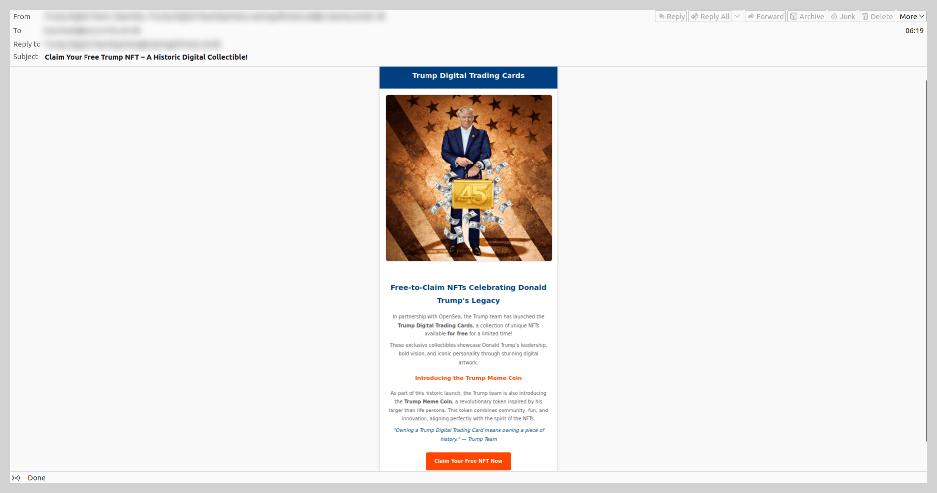 Por exemplo, após o lançamento de memecoins $TRUMP, vinculados à posse de Donald Trump, vimos mensagens de scam sobre o lançamento de Trump Meme Coin e Trump Digital Trading Cards. Neles, os golpistas sugeriam que as vítimas abrissem um link para obterem NFT grátis.
