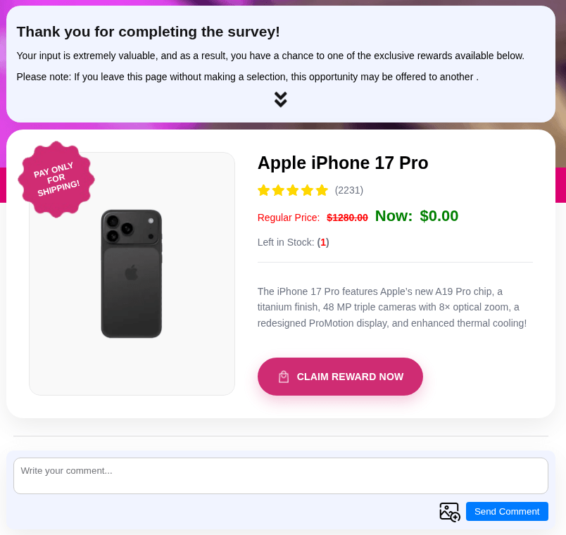 No quarto trimestre de 2025, como é tradicional durante a apresentação do novo modelo de iPhone, detectamos mensagens fraudulentas com pesquisas que supostamente permitiam ganhar um iPhone 17 Pro ao respondê-las.