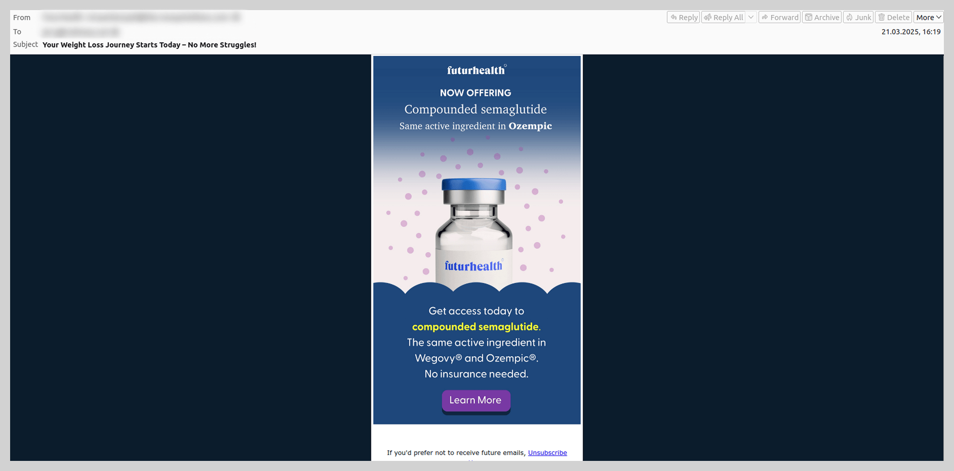 A popularidade do “Ozempic” também se refletiu em envios massivos de spam. Os usuários receberam propostas insistentes para comprar um medicamento falso ou análogos suspeitos.