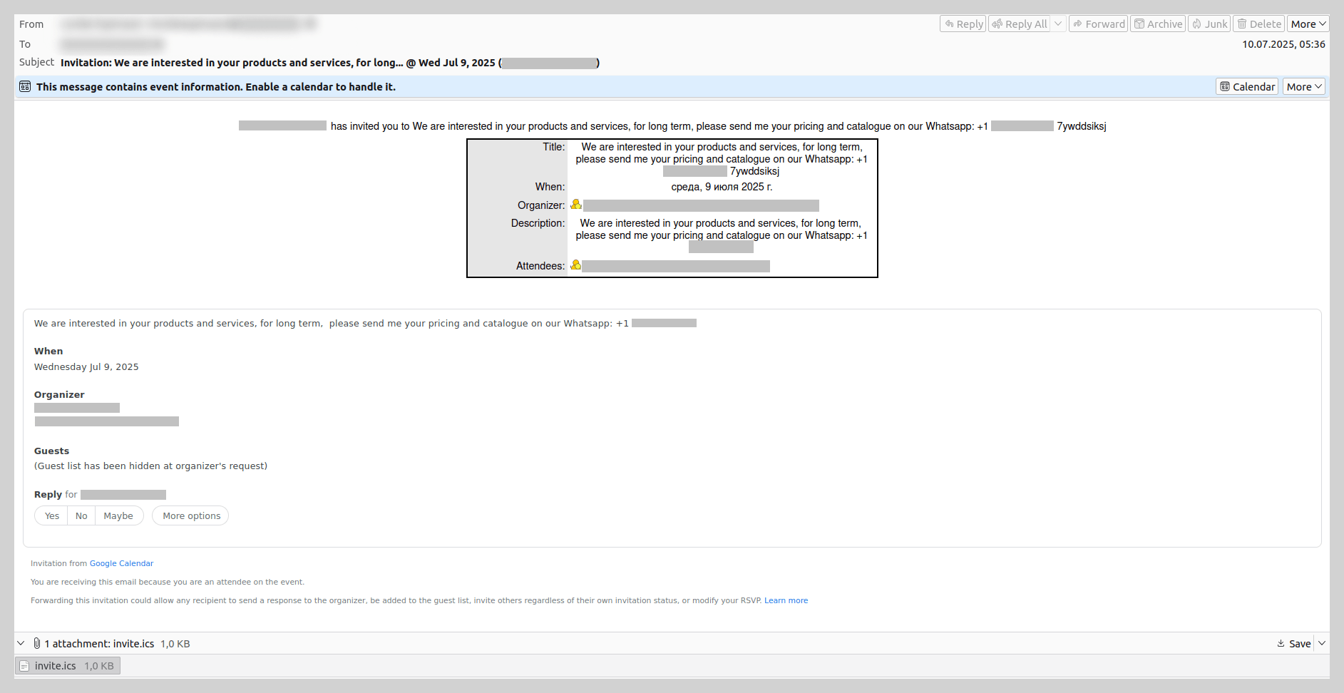 Em 2025, os cibercriminosos difundiram ameaças por e-mail por meio de diversos serviços do Google com mais frequência que antes. Observamos, por exemplo, o uso do Google Calendar. Os golpistas criavam uma reunião, em cuja descrição indicavam um número para contatar no WhatsApp, e enviavam o convite à vítima. As empresas enviavam e-mails com solicitações de produtos, por exemplo, e sugeriam passar para um aplicativo de mensagens para continuar negociando uma colaboração.