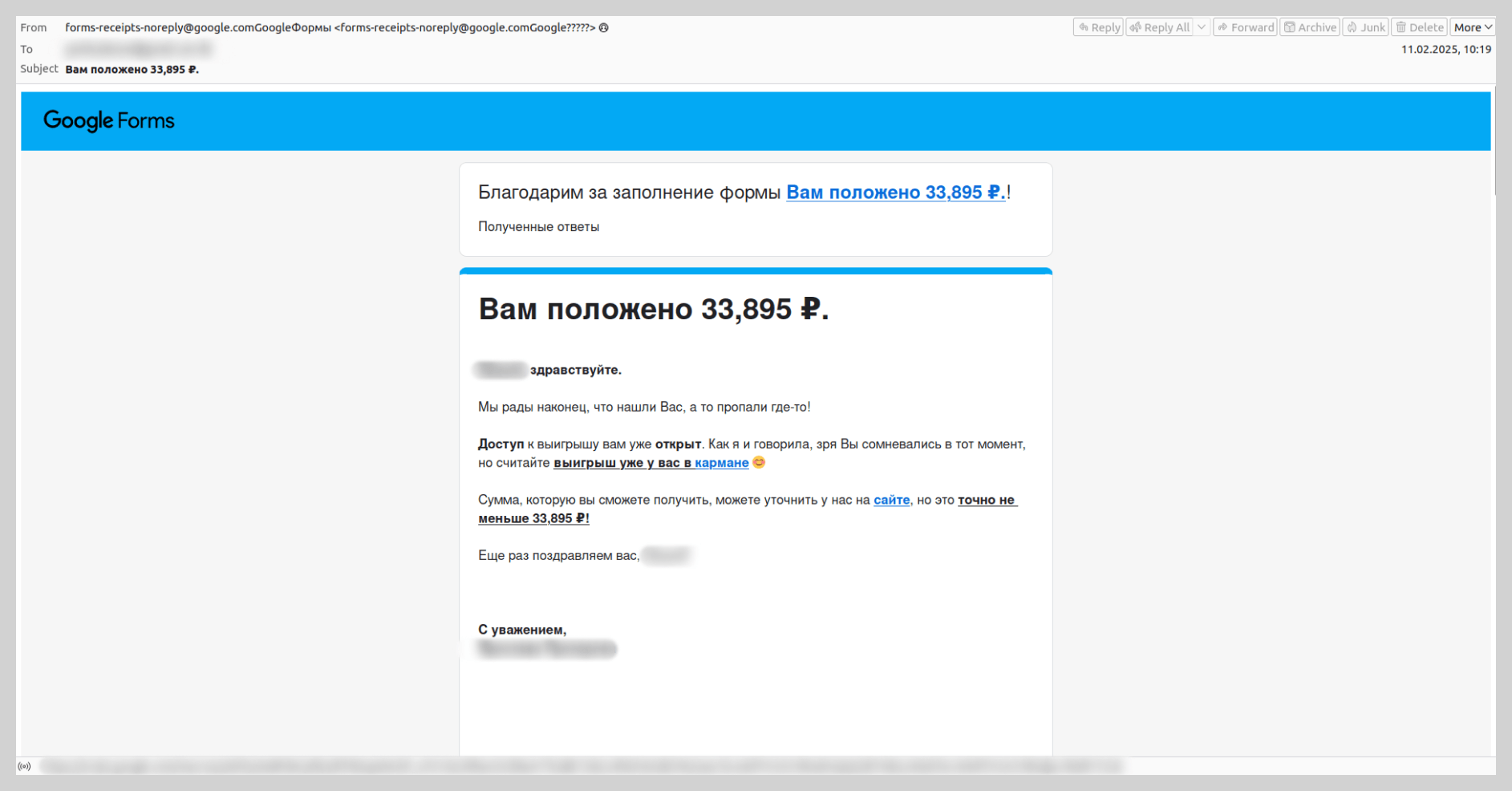 Nos últimos anos cresceu o número de ataques fraudulentos por meio do Google Forms. Neles, os golpistas criavam uma pesquisa com um título atraente e inseriam o texto fraudulento em sua descrição. Em seguida, preenchiam seu próprio formulário e, no campo de e-mail, inseriam os endereços das vítimas. A esses endereços chegavam notificações reais do Google Forms sobre um formulário preenchido. Para os filtros de e-mail, elas pareciam legítimas, já que eram enviadas de servidores de e-mail do Google. O objetivo dos cibercriminosos era que a vítima não prestasse atenção ao cabeçalho do formulário, mas à descrição isca, que continha o link fraudulento.