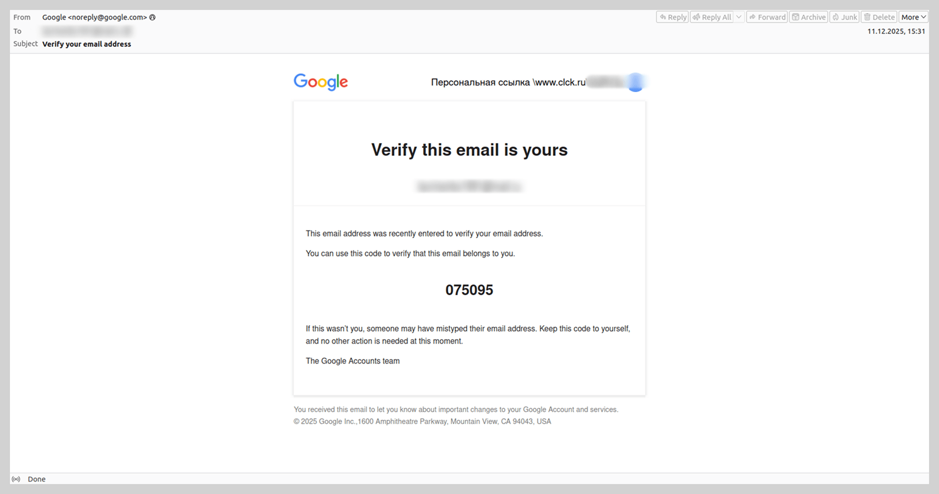No final de 2025 detectamos um e-mail do Google completamente legítimo do ponto de vista técnico, mas que continha um link fraudulento. O e-mail também continha um código de confirmação para a verificação do e-mail do destinatário. Os golpistas manipulavam o formulário de registro de contas para redirecionar a atenção do destinatário para o site fraudulento. Por exemplo, em vez do nome e sobrenome do usuário, inseriam o texto “Link pessoal” e o link fraudulento, usando técnicas de ofuscação. Assim, no exemplo descrito, trocavam a barra inclinada por uma barra invertida e adicionavam esse mesmo símbolo antes da URL. No campo para inserir o e-mail, indicavam o endereço da vítima e, deste modo, o usuário recebia uma notificação legítima com um link para o recurso de scam.