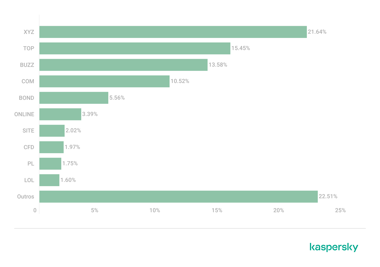 Em 2025, ao contrário da tendência observada nos últimos anos, a maioria das páginas de phishing hospedou-se na zona de domínio XYZ, com 21,64%, o que triplica a porcentagem registrada em 2024. Em segundo lugar posicionou-se o domínio TOP com 15,45%, seguido por BUZZ com 13,58%. Esta popularidade explica-se pelo baixo custo para registrar um website nesses domínios. Em quarto lugar ficou o domínio COM (10,52%), que até agora sempre havia liderado o ranking. Cabe destacar que esta diminuição deve-se em parte à popularidade de ataques com typosquatting, ou seja, não é raro que os cibercriminosos falsifiquem sites no domínio COM (por exemplo, example-com.site em vez de example.com). Após COM segue a zona BOND, que pela primeira vez entrou no ranking com 5,56%. Comumente, nela há recursos sobre temas financeiros, o que explica o aumento do interesse dos invasores por registrar páginas de phishing nessa zona. Em sexto e sétimo lugar ficaram ONLINE (3,39%) e SITE (2,02%), que em 2024 ocupavam a quarta e quinta posição, respectivamente. Além disso, tiveram popularidade três zonas que não apareciam antes em nossa estatística. Trata-se de CFD (1,97%), que se usa para recursos em áreas de roupa, moda e design; o domínio nacional da Polônia PL (1,75%); e a zona LOL (1,60%).
