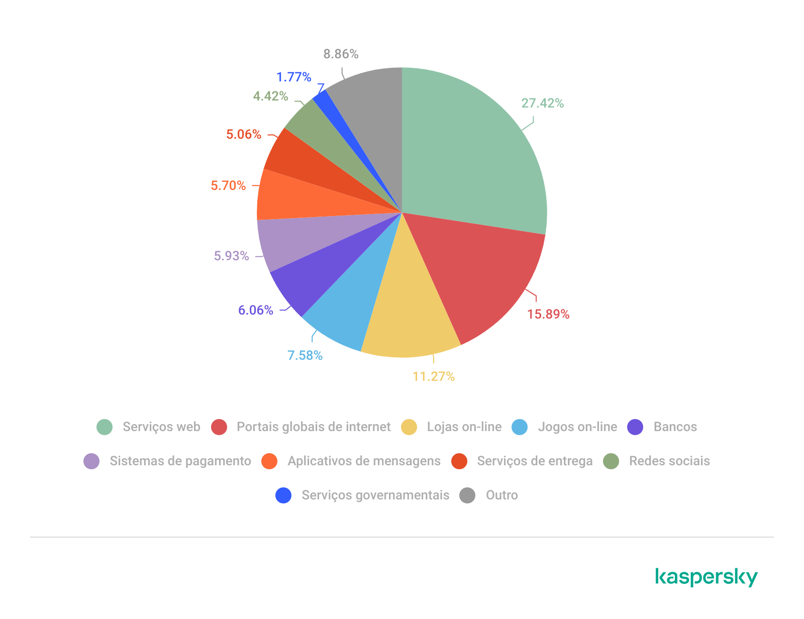 As páginas de phishing que fingiam ser serviços web (27,42%) e portais globais de internet (15,89%) mantiveram suas posições dominantes no TOP 10, ocupando o primeiro e segundo lugar, respectivamente. As lojas virtuais, que são um alvo habitual dos cibercriminosos, voltaram ao terceiro lugar com 11,27%. Em 2025, cresceu o interesse dos phishers por usuários de jogos virtuais; sites que fingem ser de jogos subiram do nono ao quinto lugar no ranking (7,58%). Em seguida vieram os bancos (6,06%), os sistemas de pagamento (5,93%), os apps de mensagens (5,70%) e os serviços de entrega em domicílio (5,06%). Também se dirigiram ataques de phishing a contas em redes sociais (4,42%) e em serviços governamentais (1,77%).