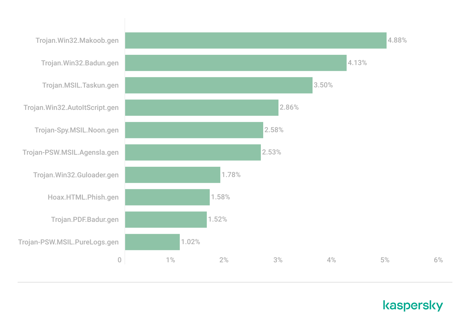 A distribuição de malware, como de costume, repete quase que completamente a distribuição de famílias maliciosas. As únicas diferenças são que uma variante do stealer Agensla ficou não em quarto, mas em sexto lugar com 2,53%; e as amostras Phish (1,58%) e Guloader (1,78%) trocaram posições. No último lugar do ranking ficou o ladrão de senhas Trojan-PSW.MSIL.PureLogs.gen com 1,02%.