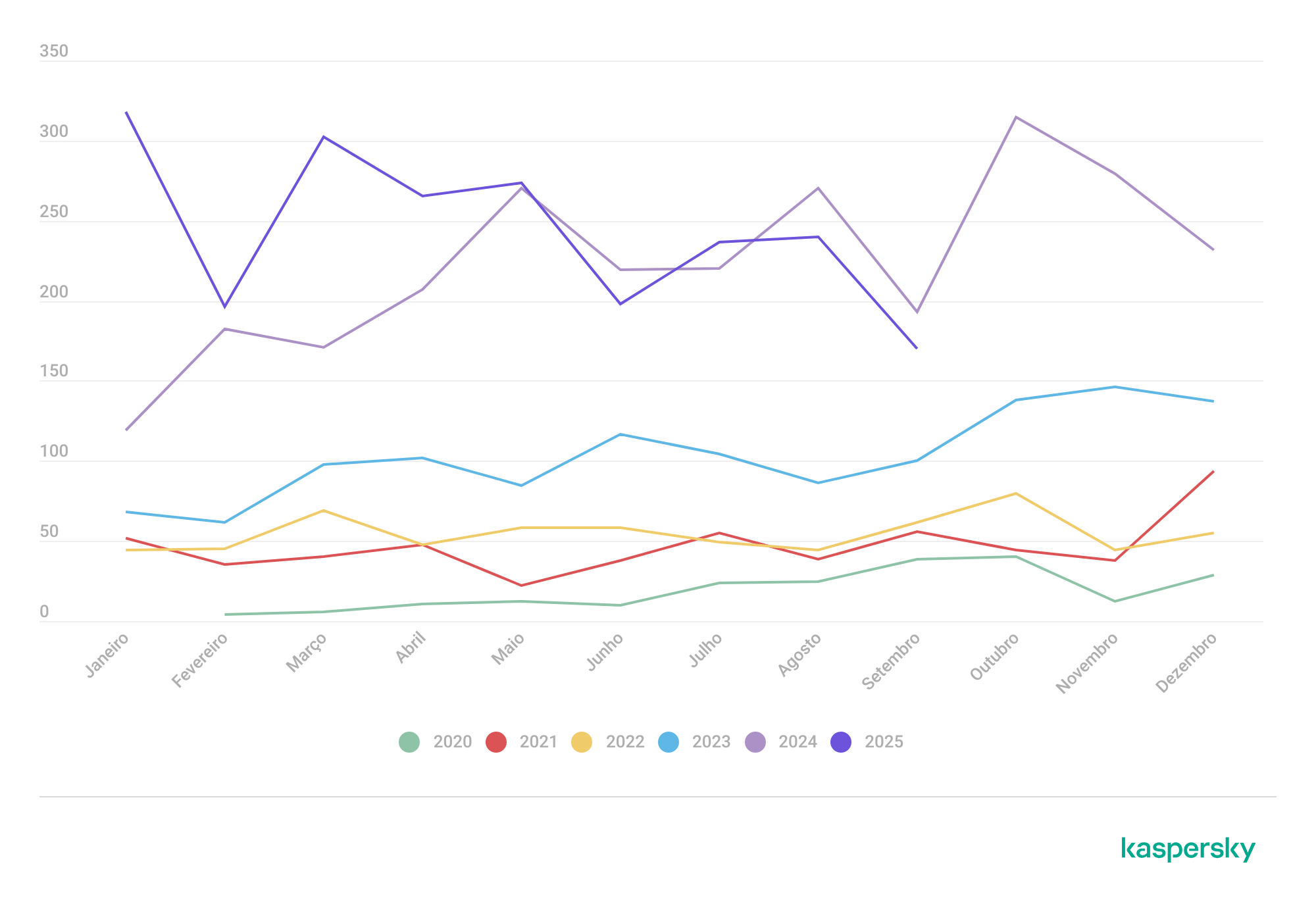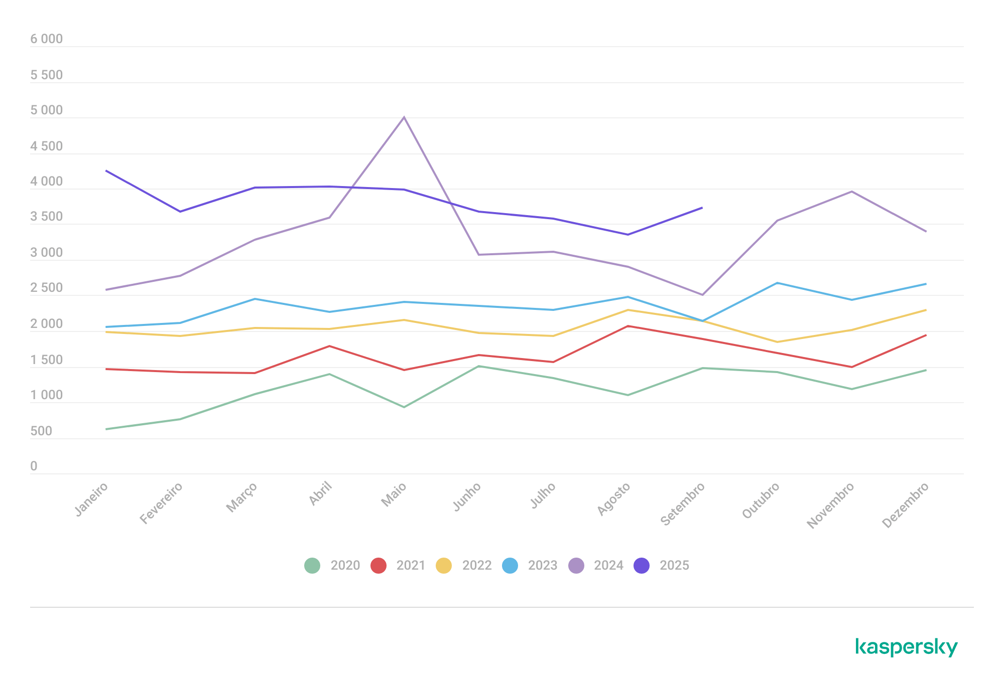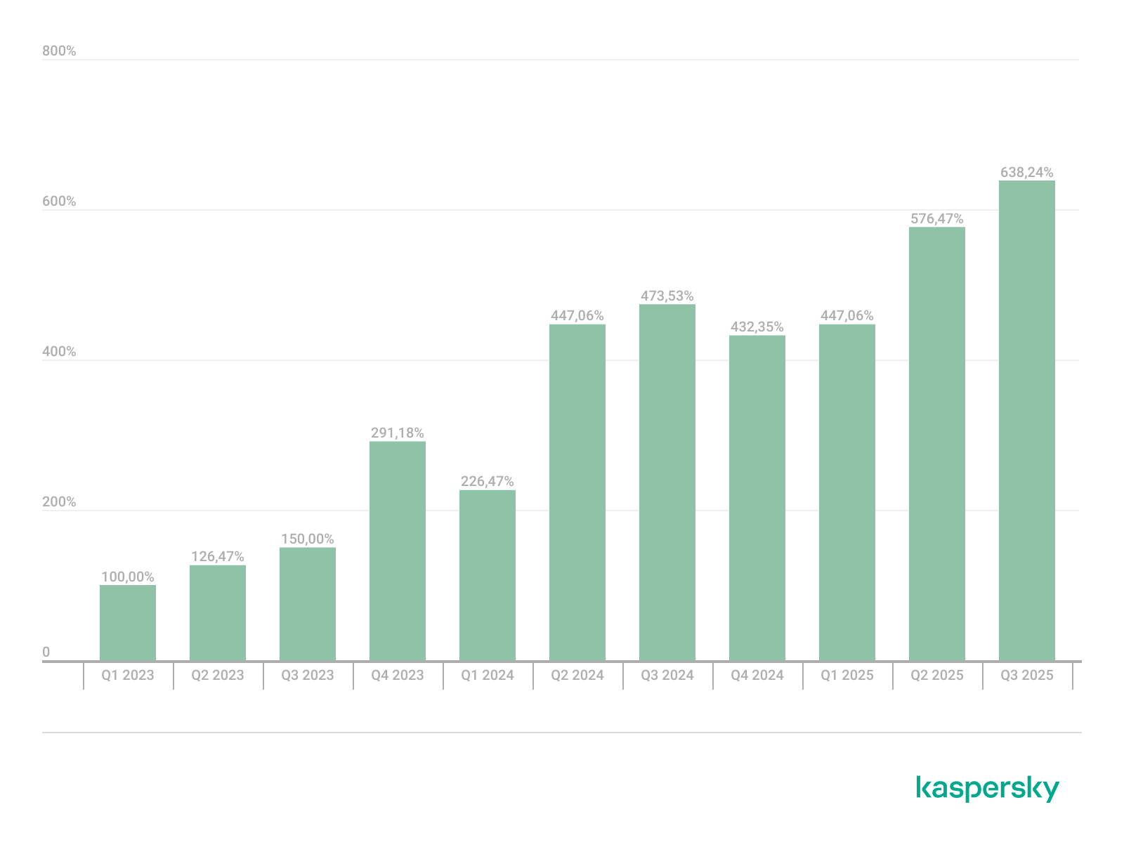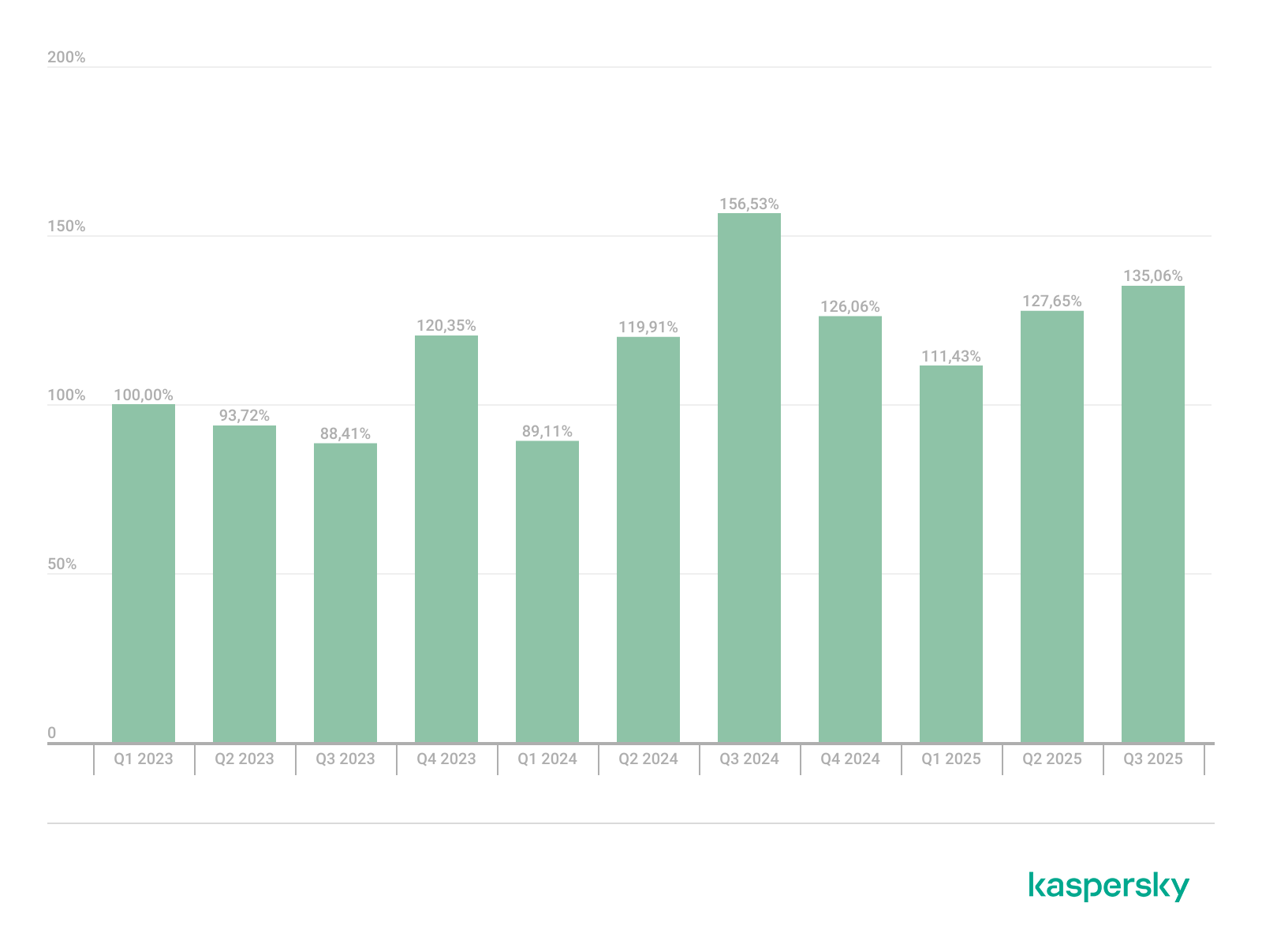 Se observarmos o número de usuários que enfrentaram exploits, vemos que ele continua crescendo e, no terceiro trimestre de 2025, já é mais de seis vezes superior ao do primeiro trimestre de 2023.