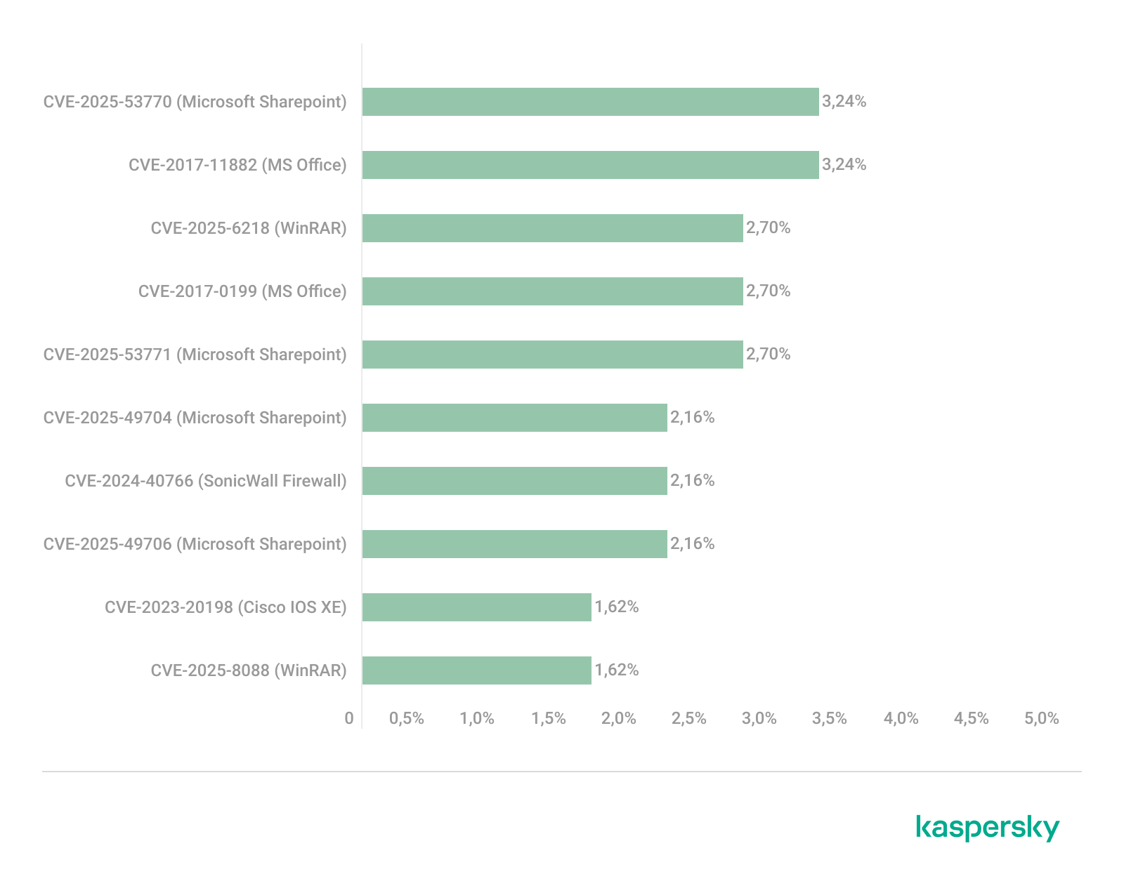 Esta seção apresenta estatísticas de uso de exploits no terceiro trimestre de 2025. Os dados correspondentes foram obtidos de fontes públicas e de nossa telemetria.