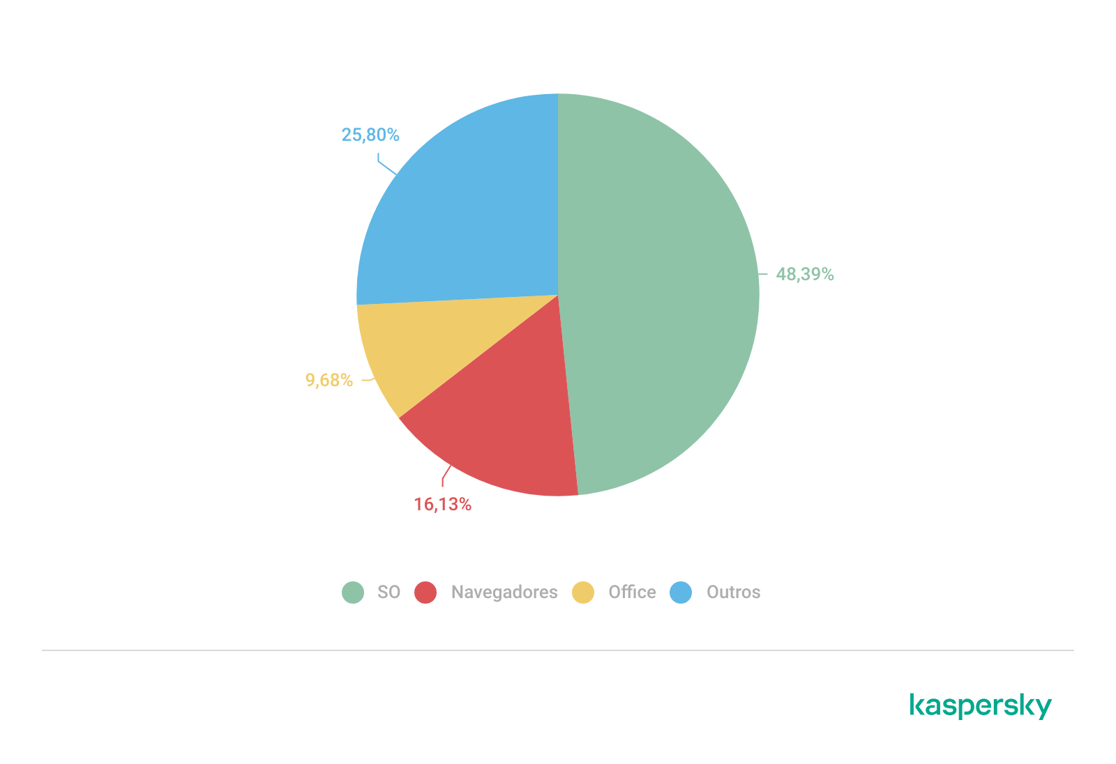 No terceiro trimestre de 2025, os exploits para vulnerabilidades do sistema operacional continuaram prevalecendo sobre os de outros tipos de software que acompanhamos em pesquisas públicas, notícias e monitoramento de PoCs. Observou-se, no entanto, um aumento significativo na proporção de ataques a navegadores, que atingiu níveis comparáveis aos de outros softwares não pertencentes ao sistema operacional.